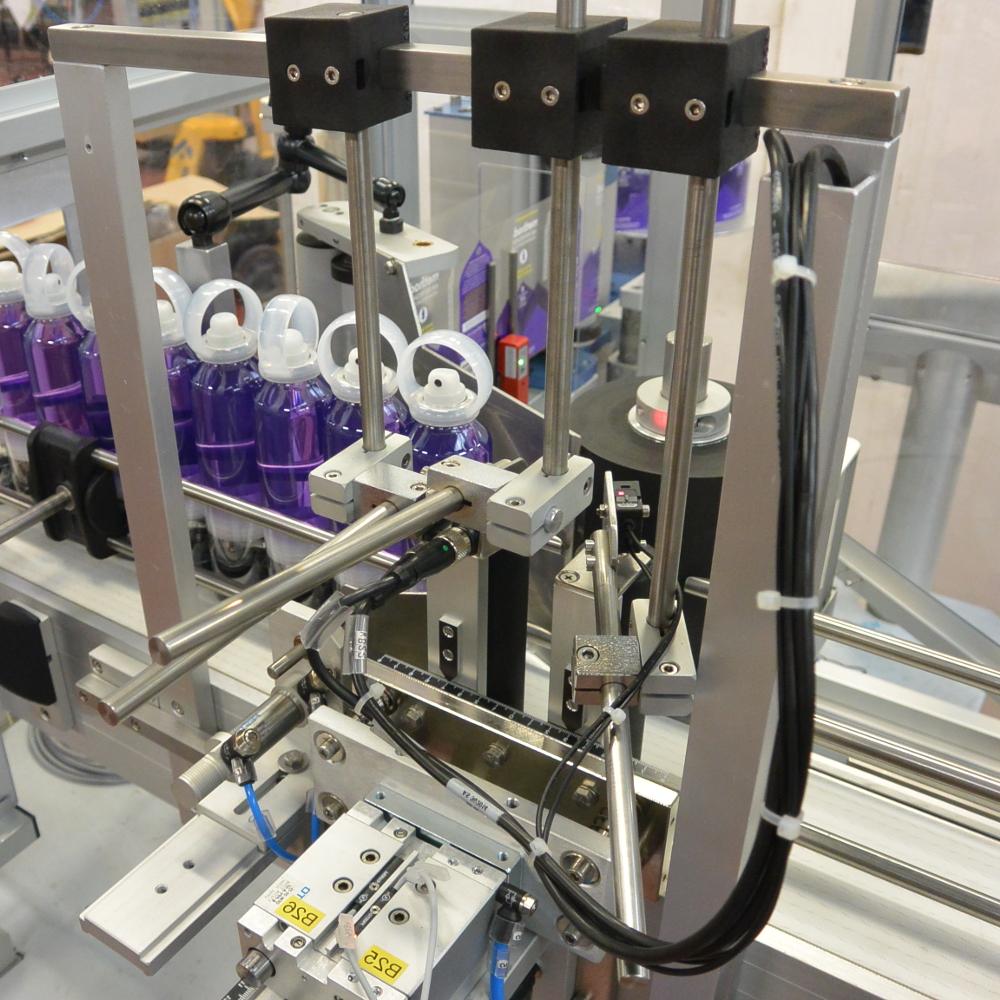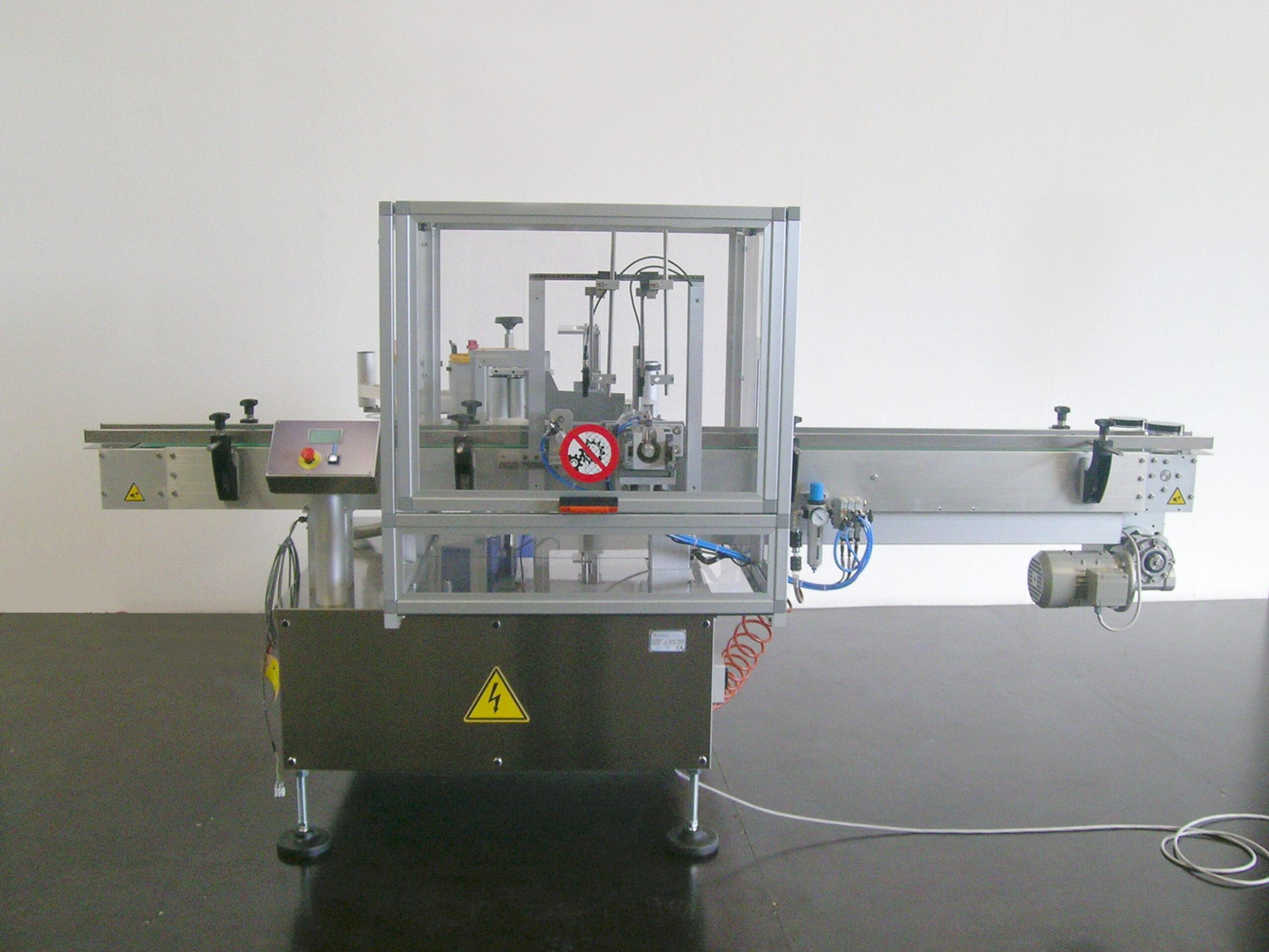 Automatische etiketteermachine Systeem 1 Turning om cilindrische producten rondom te etiketteren. Door gebruik te maken van 3 rollen om het etiket rondom de producten aan te brengen, is dit systeem zeer geschikt voor het etiketteren van conische en onstabiele producten.