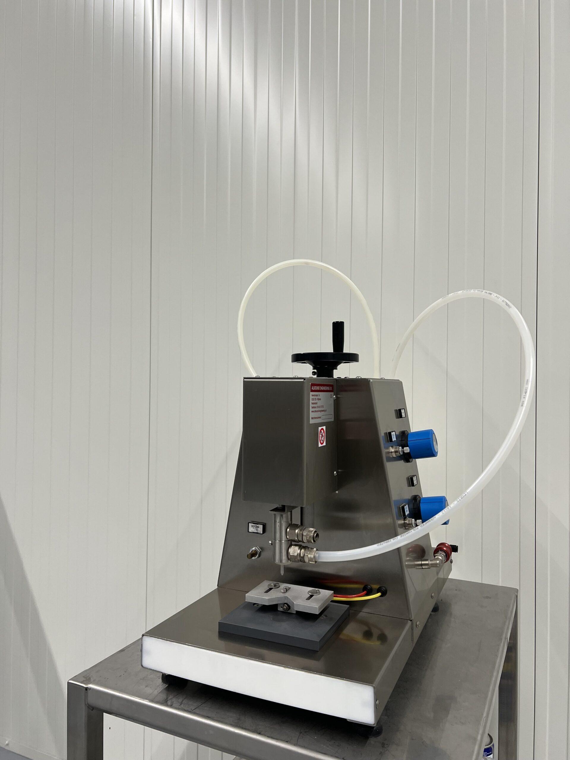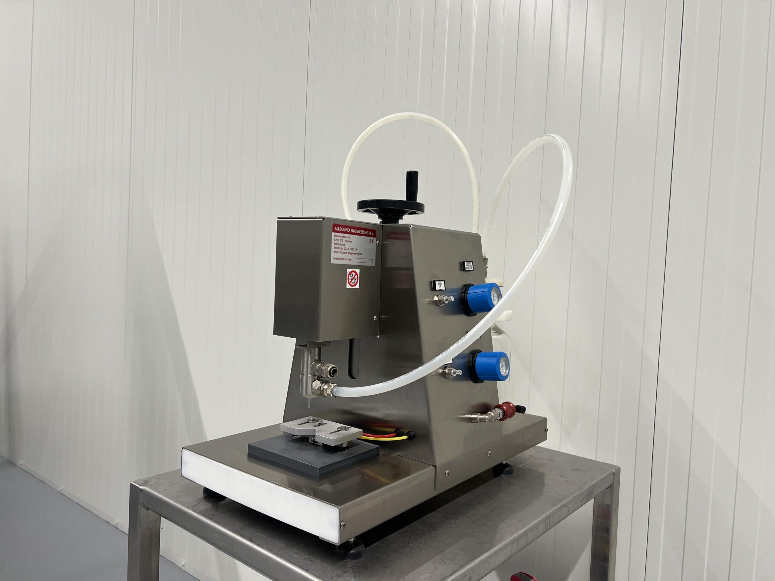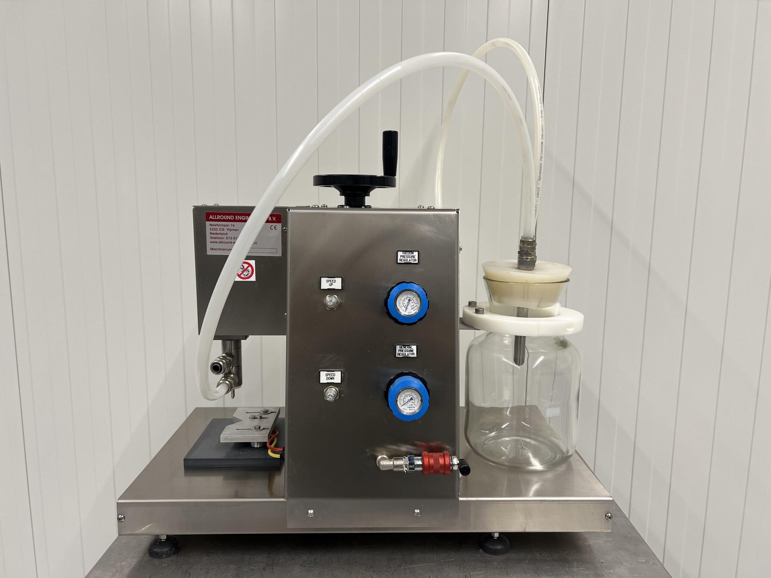 De machine is gemaakt van RVS 304 en wordt geleverd met een glazen tank op de achterzijde. Een aanzuigslang verbind de machine met een product voorraadtank. De tweede slang verbind de doseergroep met de glazen tank. Overtollig product wordt automatisch door het doseermondstuk afgezogen in de glazen tank geplaatst op de achterzijde van de machine (deze wordt gebruikt als een opslagtank om overtollig product op te slaan).